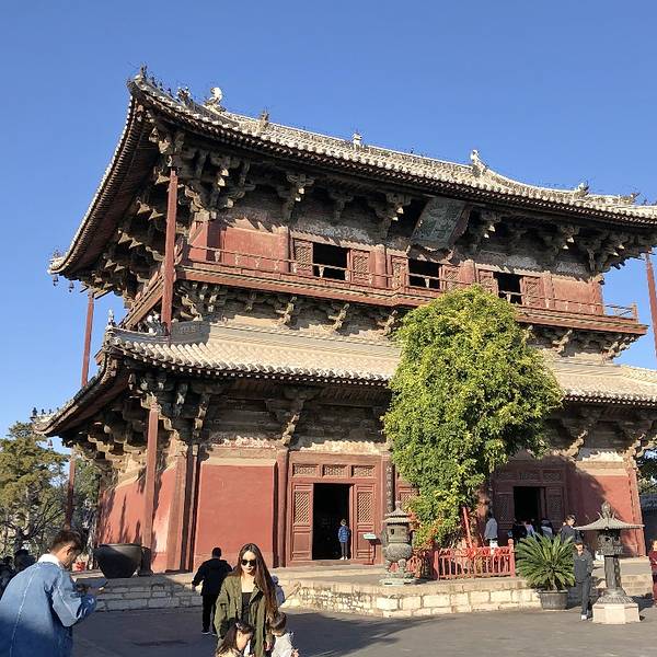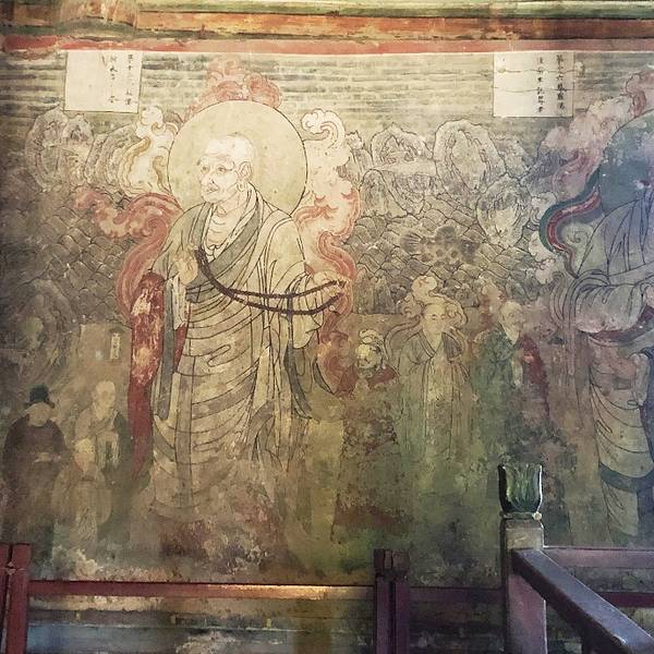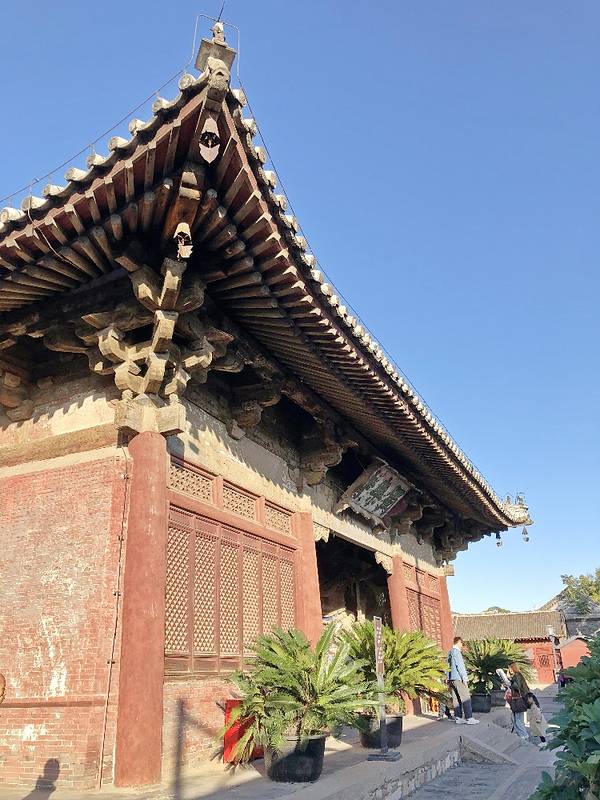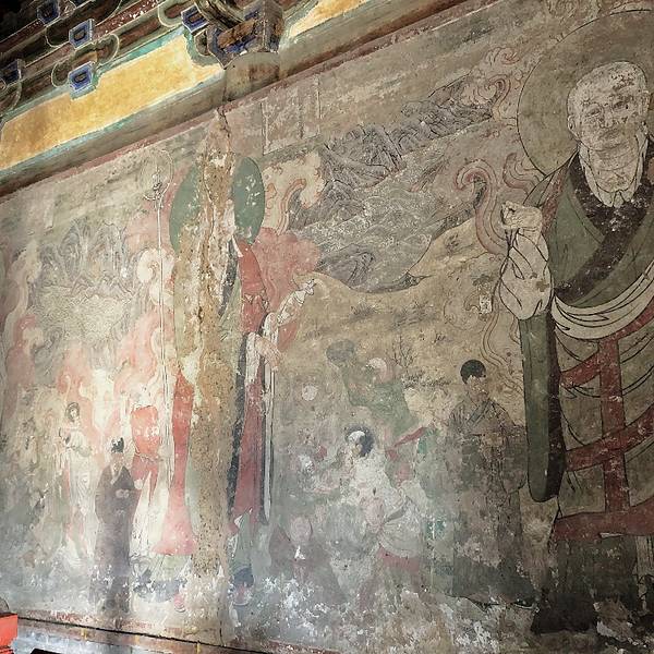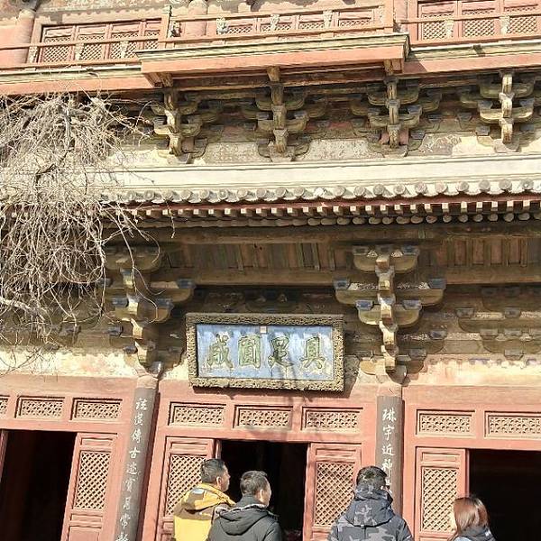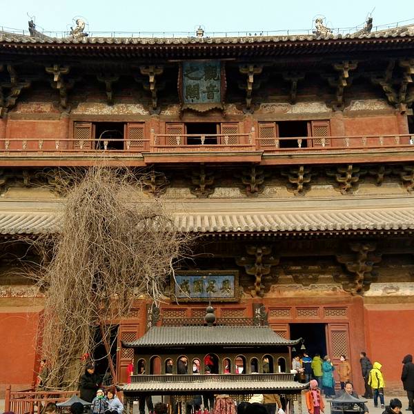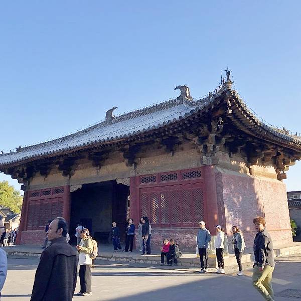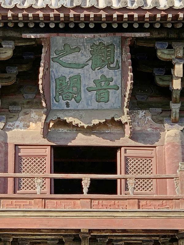 大殿上的藻井、四周复杂的斗拱,让人看着眼花缭乱,同时也深感该建筑的高超技艺。四面墙上的明代壁画还很清晰,内容以十六罗汉和明王像为主题,间绘神变故事、世俗题材及重修信士像,绘画以铁线描为主,兼用兰叶描,线条流畅,为元代绘制,明代重描。慢慢欣赏到观音像背后还有一组雕塑,海岛观音(亦称倒坐观音),面相俊秀,趺坐自由。东侧(左)金柱上悬立“伽蓝神”关羽,高1.3米;西侧(右)金柱上竖立护法神韦驮,高1.2米。今天阴,殿内光线很暗,照片都不清楚。在观音阁内转了几圈,从后门出来大致游了一下院子后面的内容。有东西配殿、乾隆行宫、八角亭等 。重又来到观音阁前面,才细赏那厚重的山门。山门重建于辽统和二年(984年),建筑面阔三间,进深二间。门梁柱非常大,斗拱也是比较雄硕,山门的檐角出檐也是比较平缓和深远,外檐直抖和斜拱的出现,是我国现存木结构建筑中,这种构件使用最早的实例物证,颇有唐代建筑的风格。比起观音阁山门更显厚重。庑殿顶,正脊两端的鸱尾翘起内转,就好像是鸷鸟飞翔,样子十分生动。梁思成先生称这对鸱吻是“极可罕贵之物也”,它也是我国建筑屋顶上年代最早的鸱吻之一