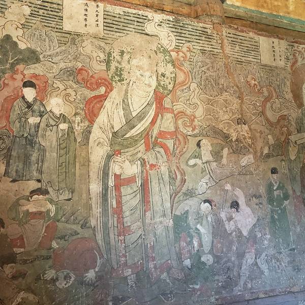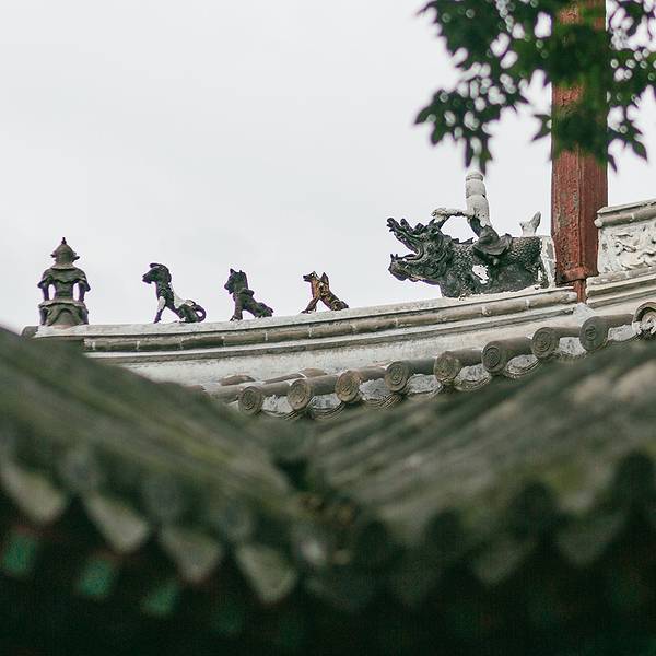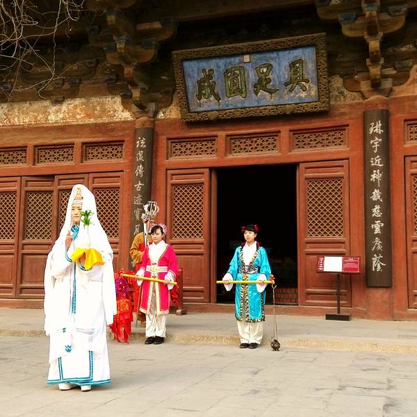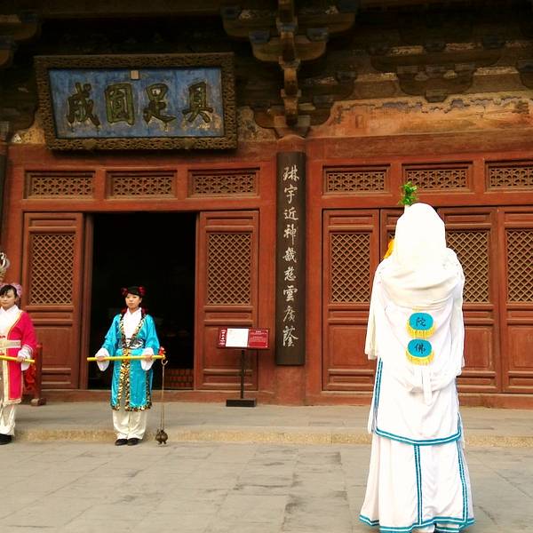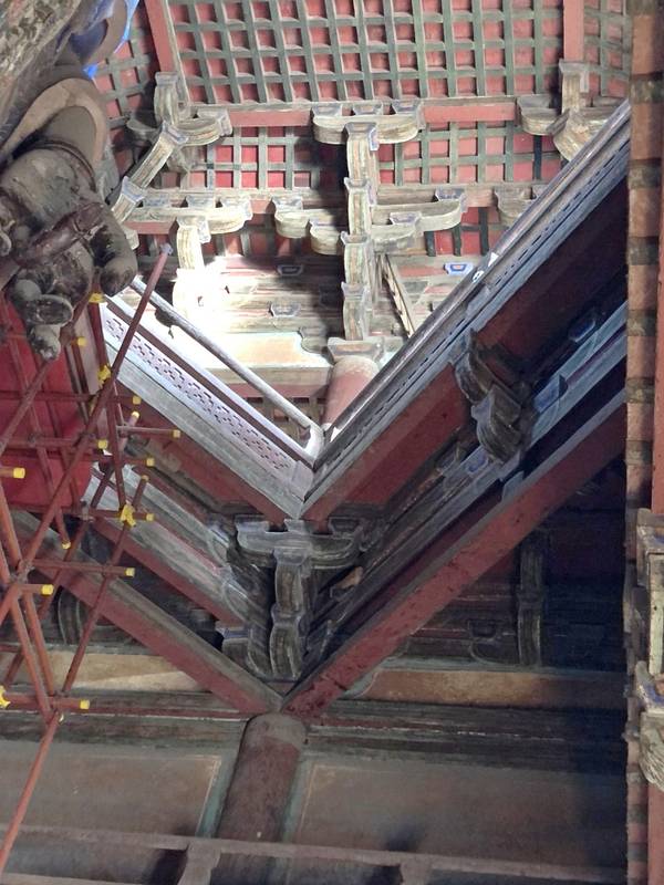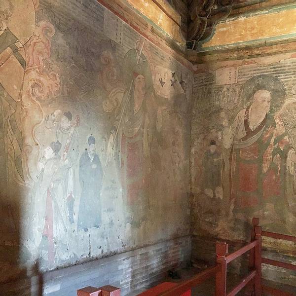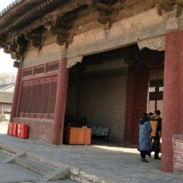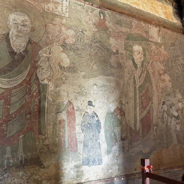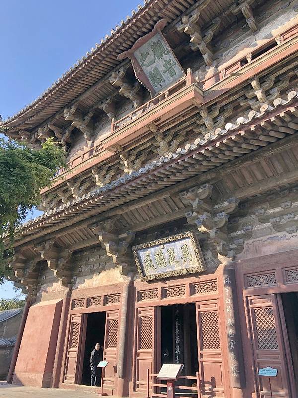 大殿上的藻井、四周复杂的斗拱,让人看着眼花缭乱,同时也深感该建筑的高超技艺。四面墙上的明代壁画还很清晰,内容以十六罗汉和明王像为主题,间绘神变故事、世俗题材及重修信士像,绘画以铁线描为主,兼用兰叶描,线条流畅,为元代绘制,明代重描。慢慢欣赏到观音像背后还有一组雕塑,海岛观音(亦称倒坐观音),面相俊秀,趺坐自由。东侧(左)金柱上悬立“伽蓝神”关羽,高1.3米;西侧(右)金柱上竖立护法神韦驮,高1.2米。今天阴,殿内光线很暗,照片都不清楚。在观音阁内转了几圈,从后门出来大致游了一下院子后面的内容。有东西配殿、乾隆行宫、八角亭等 。重又来到观音阁前面,才细赏那厚重的山门。山门重建于辽统和二年(984年),建筑面阔三间,进深二间。门梁柱非常大,斗拱也是比较雄硕,山门的檐角出檐也是比较平缓和深远,外檐直抖和斜拱的出现,是我国现存木结构建筑中,这种构件使用最早的实例物证,颇有唐代建筑的风格。比起观音阁山门更显厚重。庑殿顶,正脊两端的鸱尾翘起内转,就好像是鸷鸟飞翔,样子十分生动。梁思成先生称这对鸱吻是“极可罕贵之物也”,它也是我国建筑屋顶上年代最早的鸱吻之一