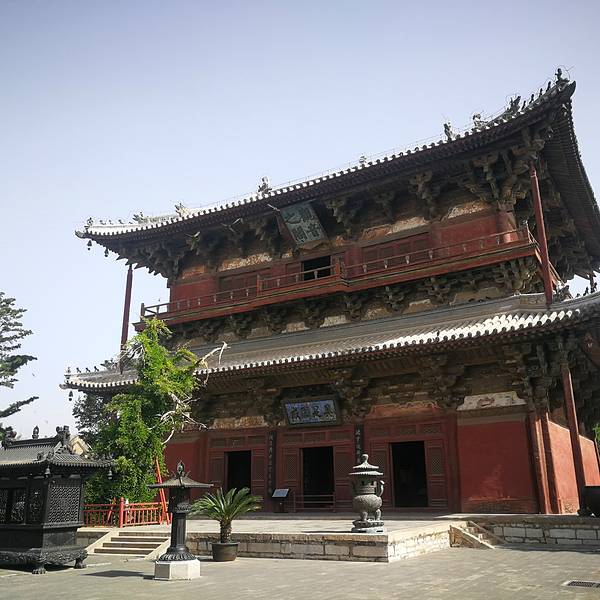 由于当时阴雨光线很差,下面片片都是第2天下午拍的观音阁重建于辽统和二年(984年),面阔五间,进深四间,上下二层“中作暗层”,就是所谓“明二暗三”,古代这样的建筑比较多。忽略掉后加的那4根立柱,整座观音阁虽然是座大型楼阁,但给我的感觉很是灵动秀美,特别是两层中间腰檐和平坐的栏杆环绕,中间位置突出像个小阳台,阳台上面的窗子正是阁内观音的头部。非常巧妙的设计。