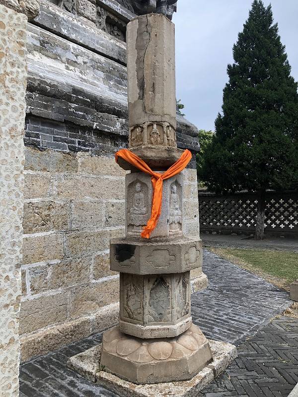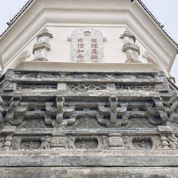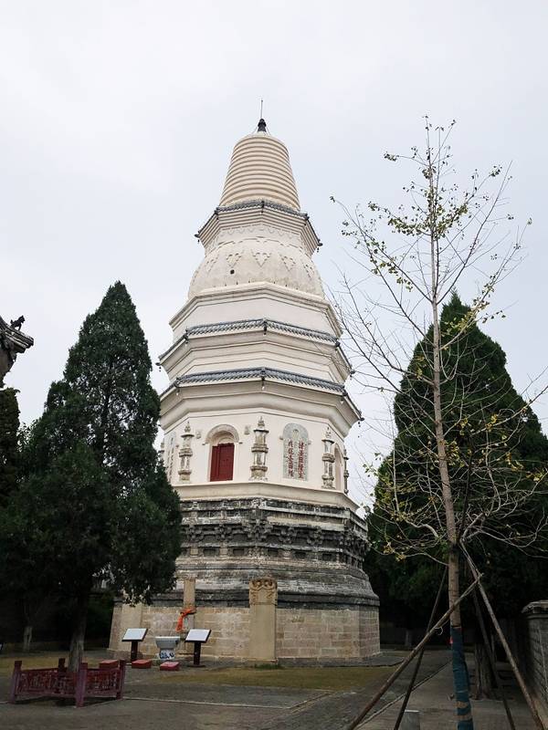 各角有硬朗汉雕像,姿态生动似在极力支顶塔身,塔身下层八角各有小塔,更陪衬孤高之白塔,其有众塔林立之感。上下三层各角共有24只惊鸟铃。我们围着白塔转了半天,在清脆悦耳叮当声中细细欣赏那些精美的砖雕,小塔,卷门等,感慨它的漂亮原来是因为独乐寺的一部分。