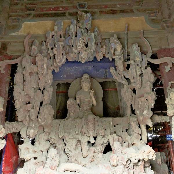 檐下所悬“观音之阁”四字匾额相传为唐代李白所书进入殿内辽代泥塑观音立于须弥座上,像高15.4米,左臂下垂,双手作接引状,下着彩绘长裙,跣足立于莲花台上。彩绘很是鲜艳,不知是那年的了。由于殿内空间有限,要高高仰头才可观看,以至于观音像冠顶置十个小佛头,很难全部看到。主像左右两侧侍立二菩萨,束发,面相谦恭、温顺。头戴“五佛天冠”上着半袖短袄、云纹披肩,下着长裙。