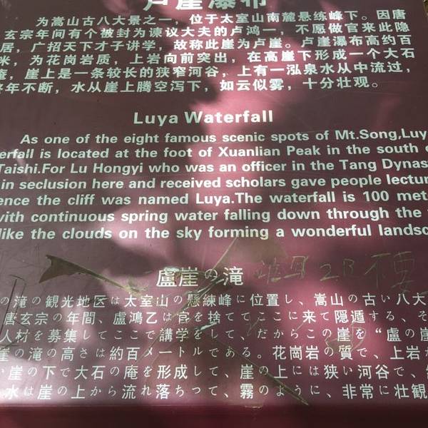 开玩笑的年轻人注意分寸,不该碰的不要碰,尤其在人还不少的景区内,自己作死不要拖累其他人……活着不好吗登顶峻极峰后,H说不走回头路……从卢崖瀑布走,想想貌似回去应该来得及,就决定先下山,然后去嵩阳书院(最后证明,人不该对自己的体力太过自信QAQ)