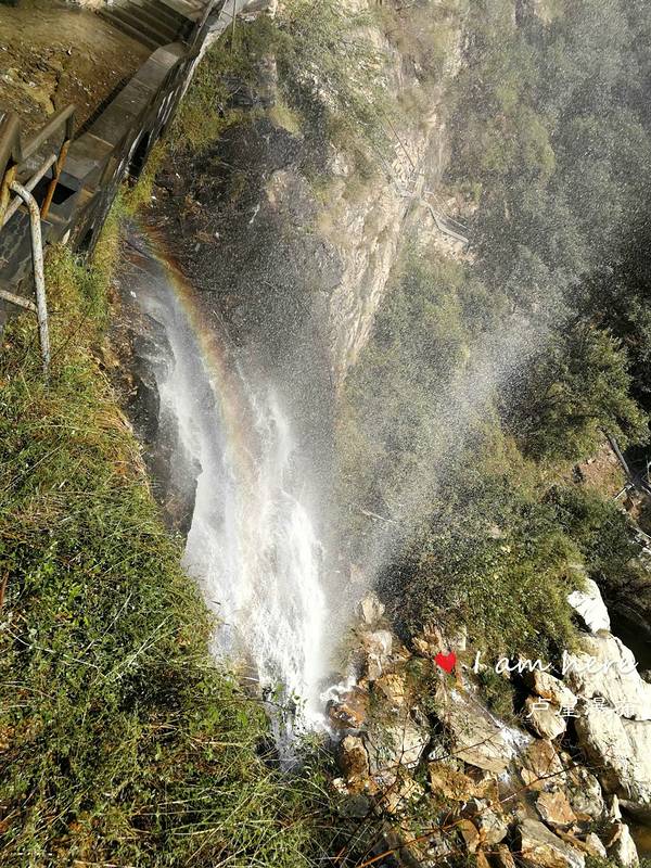 大概下午1点前到的卢崖瀑布。远远就看到了彩虹~好像是两道。离开登封那一天,出租车师傅告诉我们,卢崖瀑布一年大概也就个把月能看到彩虹,刚好国庆前下了雨~开心~