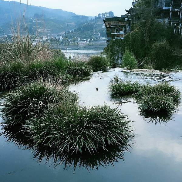 暮色四合,我穿过跳岩去对面的{观景台餐厅}吃饭,这家餐厅有个露天平台,可以边吃饭边观赏瀑布。 穿过跳岩时,云正缓缓从天边涌来,小鸟在草丛里扑腾翅膀,两个老人收起了钓竿准备回家,空气中燃烧的柴火味让人恍惚中回到了小时候。