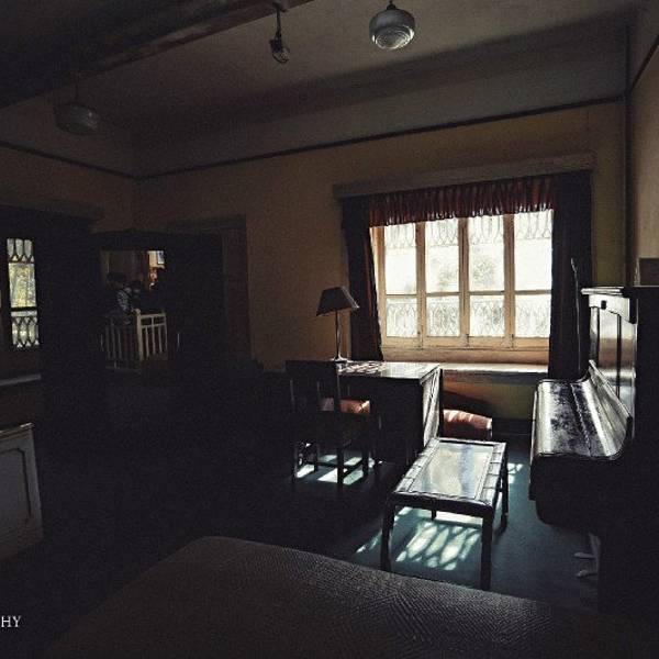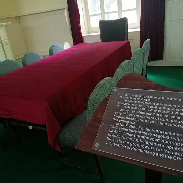 庐山牯岭东谷,有一条蜿蜒而来又蜿蜓而去的长冲河。在长冲河畔,有一座掩隐在一片绿荫深处的英国券廓式的别墅。别墅始建于1903年,由英国兰诺兹勋爵建造,1922年转让给巴莉女土,巴莉曾与宋美龄交好,1934年将这栋房屋赠送给宋美龄。 美庐别墅由主楼和附楼两部分组成,主楼为两层,附楼为一层。 登十字型长石阶,步通透式凉台,进入主楼一层是一装饰典雅、中西合璧的会客厅。猫眼绿的地毯,墨绿的沙发,墙壁上挂着宋美龄不同时期的半身照片,以及在“美庐别墅”生活的部分照片。室内陈设基本保持原貌,居中有双人厅床,据说是用英国优质木料制作,床左侧放置一圆形雕花梳妆台,方柜上摆设着精致的象牙扇等物品。 附楼从外面看是一排玻璃窗,内部布局为一边是通道、一边是各自独立的各功能用房:餐厅、琴房、侍卫室等。而今,此处被辟为展览厅。展览厅所展示的内容,可分为三个部分:一为“美庐别墅”留存物品,有宋美龄弹过的钢琴、阅读收藏的精装英文书、画的《庐山溪流》水彩画,以燃烧煤油为动力制冷的菲赛尔冰箱等;二是国民政府要员们在“夏都(庐山)”政治活动的历史照片及历史物品,有1934年9月蒋介石参加庐山军官训练团毕业典礼时的照片,1937年7月17日蒋介石与马歇尔在“美庐”凉台上会谈照片等;三是牯岭街历史风貌及三十年代所拍摄的庐山名胜照片。