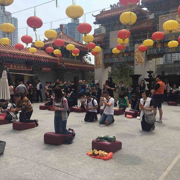 95%以上的求签者均跪地,少数观光客也有站在殿前求签的,