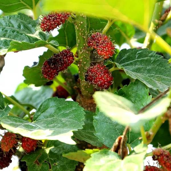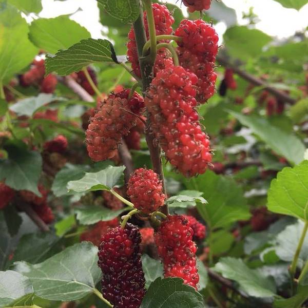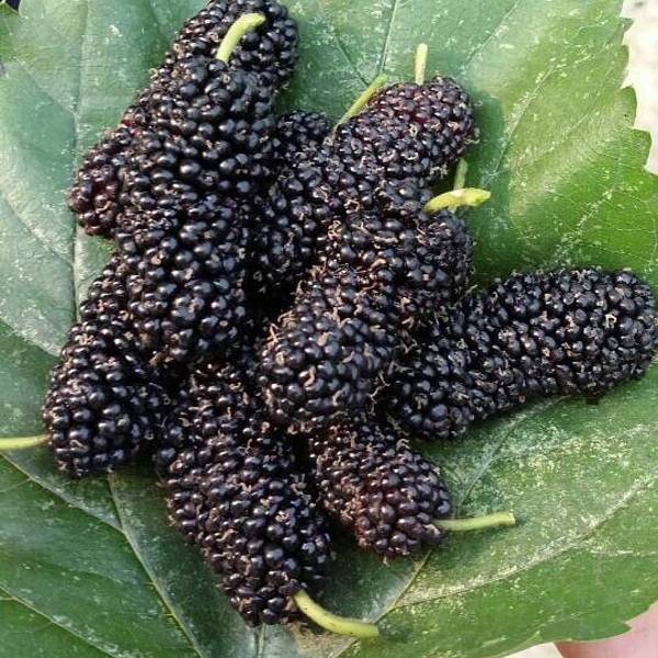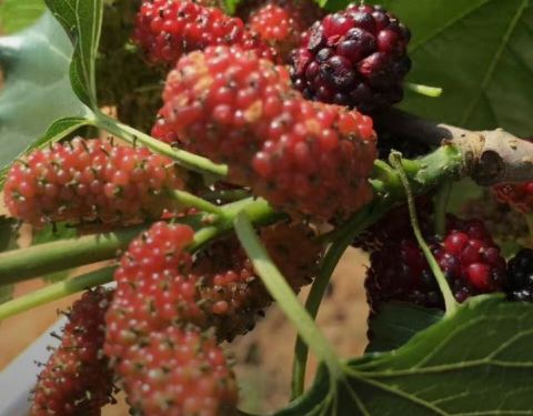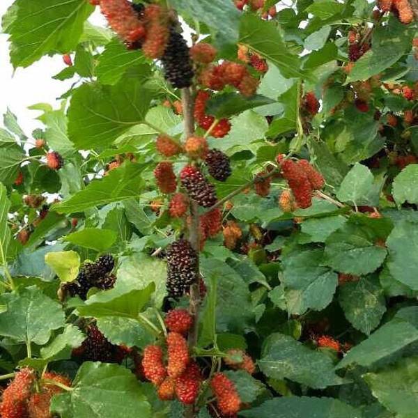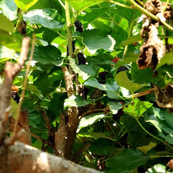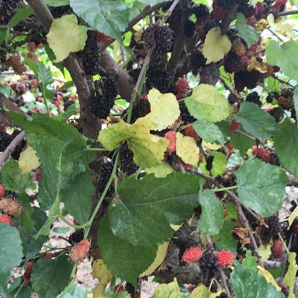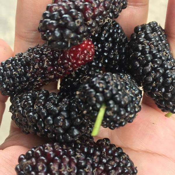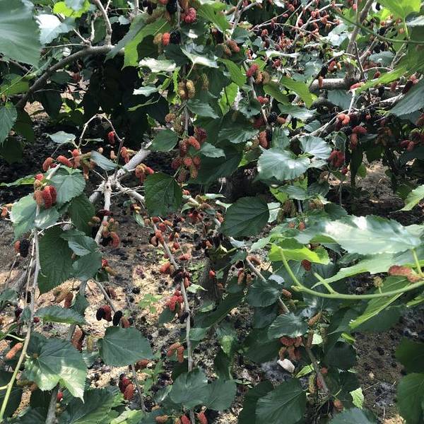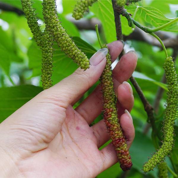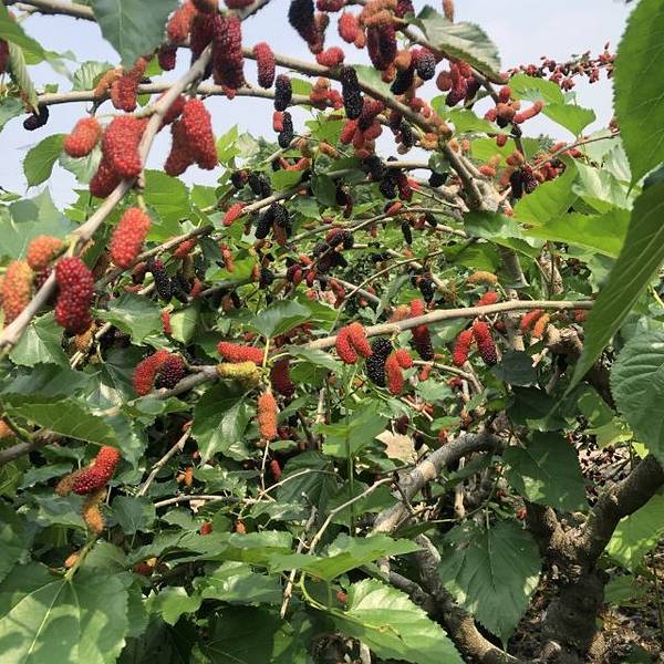 今年过去发现又培育了新的品种出来,这次不仅采到了传统的桑葚,紫黑紫黑的,汁水多很甜,但也比较容易烂,还有一种红一点小一点,酸甜酸甜,稍微晚熟一点点;发现了一个长条的桑葚,长到有十厘米长,有点酸,口感不错;另外还有一种白色的桑葚,看上去好像没熟,但是还挺甜,这四个品种的名字就没有留意,不记得了。