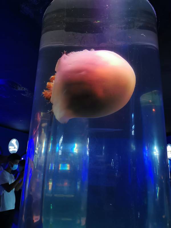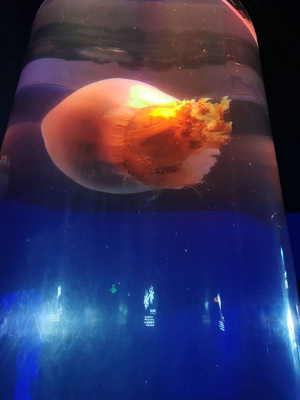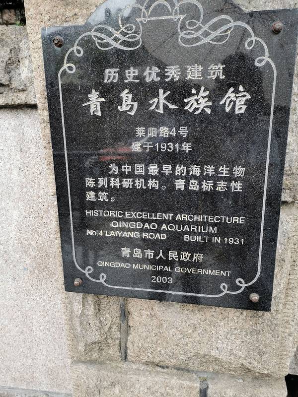 大门处很有年代感的刻字。水族馆内梦幻水母宫里的水母很漂亮,拍了很多水母的照片,在此就不放太多了。