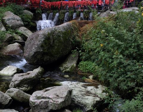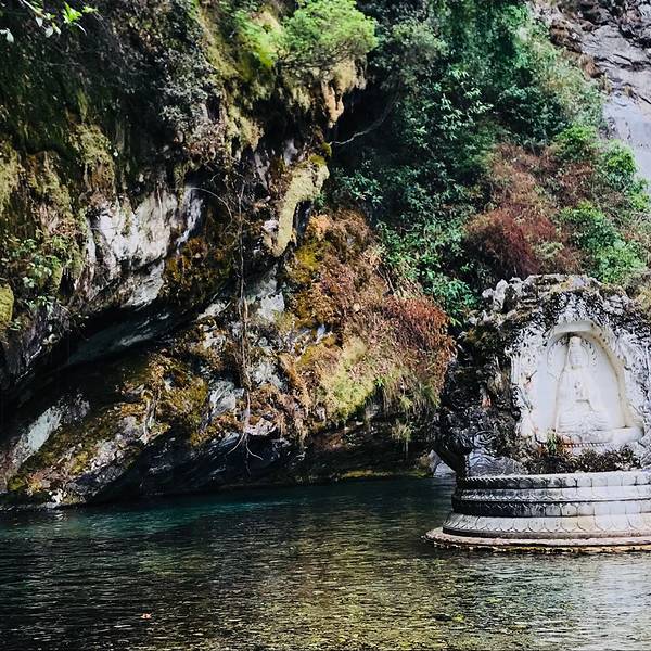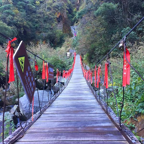 原本在游客中心看到清碧溪图片是有瀑布的,所以一直以清碧溪为目标坚持走到这里,结果到了才发现没有瀑布,有点失望吧。清碧溪是个自然景观,好看但是手机拍出来没有什么感觉。溪水也是出奇的清澈冰冷,甚至刺骨。溪水中央是一尊菩萨,很多人打卡拍照,沿路的索桥系满了同心锁,游玩的情侣可以买一个玩玩。