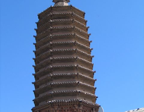 仿木造型古朴细腻,下悬铁铎随风而动,同样的精美沧桑,同样的铎声叮咚,与玉皇阁一南一北,相映成趣。须弥座塔基、雕有兽头的八角型塔座、镶有铜镜的十三层密檐塔身和铁铸塔刹构成了浑然一体的古塔,虽历经风雨,却屹立不倒。