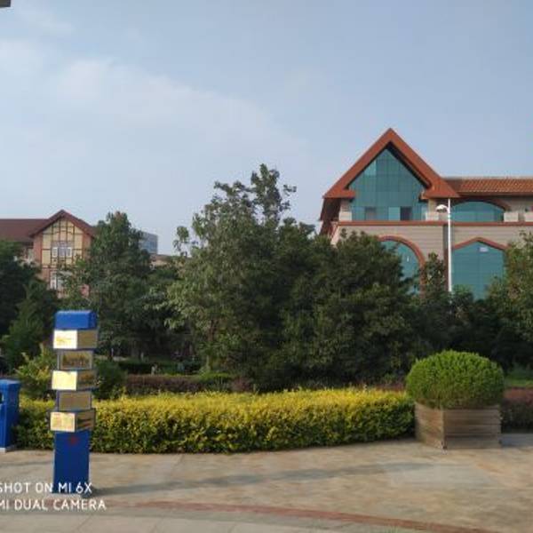 建筑有特点,中西结合,远处有山,再远处有现代化大楼。