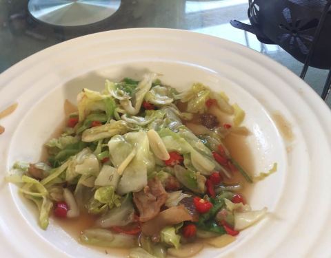 味道还行吧。点了一个炖鱼。没什么味儿。老北京烤羊肉还不错。羊肉味儿不是很大。蟹黄豆腐…这个味道…真不敢恭维。干锅茶树菇味道一般。桂花藕有点儿太甜了。包菜味道还行吧。价格比较亲民。但是味道,只能说凑合吧。