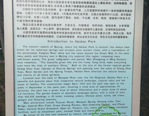 海淀公园,位于北京西北四环万泉河立交桥的西北角,是历史上北京三山五园之一—畅春园的遗址海淀公园,位于北京西北四环万泉河立交桥的西北角,是历史上北京三山五园之一—畅春园的遗址。公园里有水,有树,有花儿,景色优美。