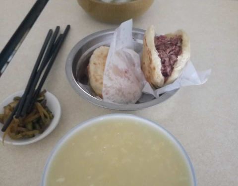 吃的是焖子肉的火烧和紫菜蛋花汤。火烧里……肉真的很少……第一次吃这么少肉的焖子肉蛋花?没有蛋花,就是鸡蛋直接打进去了,一小缕紫菜……味道偏淡。一般