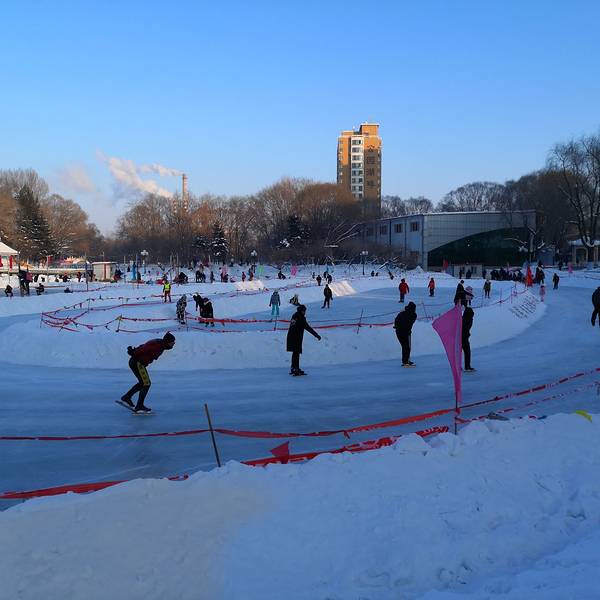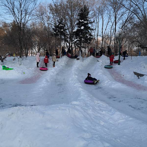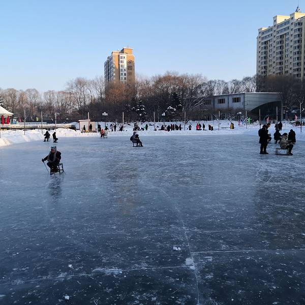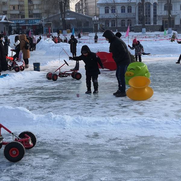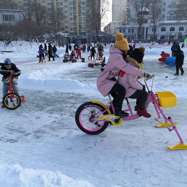 哈尔滨有着历史悠久的阿城区。会宁公园冰上世界。冰爬犁冰上自行车抽冰嘎滑雪圈