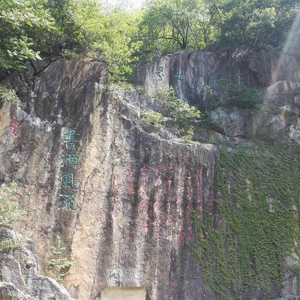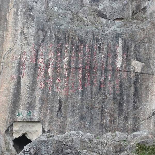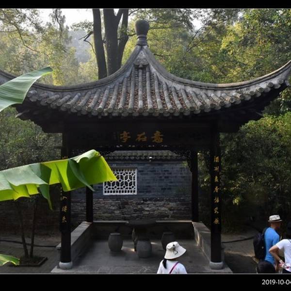之前寻找两个遗址的冤枉路走了有大半个小时,路上还遇到几处迎面而来的旅行团,可能都是从小路也就是琅琊古道上山的,回到正道上走了半小时左右,终于看到双泉亭并最终到达同乐园。验票进入后,看到主要是欧阳修纪念馆,逐年生平和文献资料以及书法石刻碑文等,当然还有醉翁亭记的全文(这段文字在整个琅琊山景区里以各种表现形式,书法、碑刻、音频等出现了N次,这里还有学生看着书法在朗读,真是活学活用),最值得看的是这里有巨大池塘和山崖石刻,醉翁之意不在酒等,非常有气魄,这里歇息的人也很多,从山上一路下来走到这里,觉得庆幸没有从这里走古道上山,因为下山就觉得不容易,如果沿此路上山,肯定体力耗费要比走大路大很多。