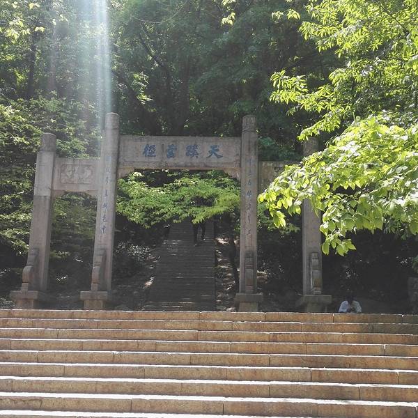 再向前就走到景区最深处,有最后一个岔口,一是向右上琅琊寺,参观完琅琊寺全部景点后由寺庙上山登顶南天门,二是直接通过“天蹊云径”石牌坊开始上山登顶,看完琅琊寺,继续向里就到了登顶南天门的石阶路,虽然看网上说台阶数较多,爬起来要费一定体力,但真正爬了下感觉十来分钟就到了,边爬边数石阶数,大概400个左右,如果从牌坊那里爬,可能多一点,这个主峰号称海拔300多米,但感觉没比采石矶海拔80多米的主峰三台阁难爬,交了个和泰山主峰相同的名字,真是口气够大。到顶还是要验票进入南天门景区,但里面几个点什么碧霞殿啥的都在修建,因此无法观看,只是在上面登了塔眺望了下滁州全景,四周全被山峰植被覆盖了,虽然一片翠绿很生机勃勃,但把现代化建筑全部遮掩了,反而看起来有点不习惯,觉得原生态得有些生硬,看完不走回头路,沿着山间继续向东,决定走山间小路下山。