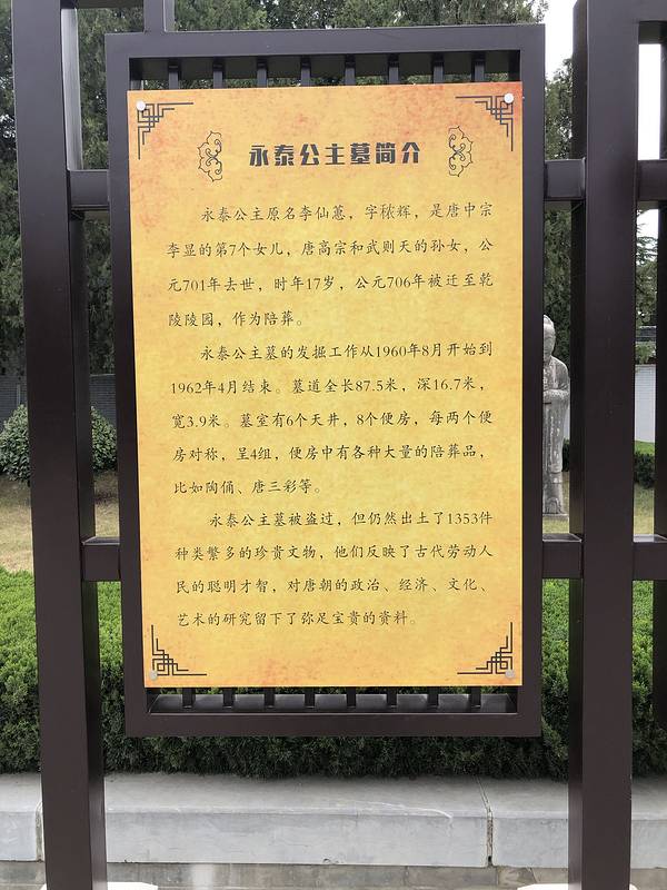 永泰公主墓的门票包含在乾陵门票里面,靠近乾陵博物馆。永泰公主墓,在乾县北部,是乾陵17座陪葬墓之一永泰公主墓的门票包含在乾陵门票里面,靠近乾陵博物馆。永泰公主墓,在乾县北部,是乾陵17座陪葬墓之一。永泰公主是唐中宗李显的第7个女儿,唐高宗李治和武则天的孙女。
