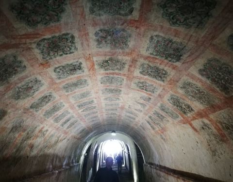 永泰公主墓就在乾陵博物馆内,穿过长长的墓道,有点凉飕飕的。墓道两侧还有残存的部分壁画,圆形的墓道顶上也有彩画装饰,据介绍说两侧壁画中靠下的一部分被整体切割下来在陕西省历史博物馆保存,墓道中间的两侧还有侧室,里面陈列着一下陪葬品,最后的墓室中还有石头棺椁,用厚重的石板制成的,里面已经空了。