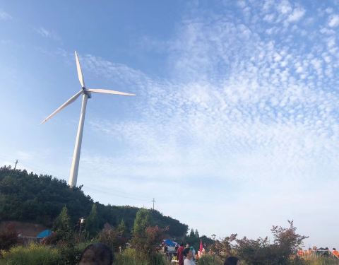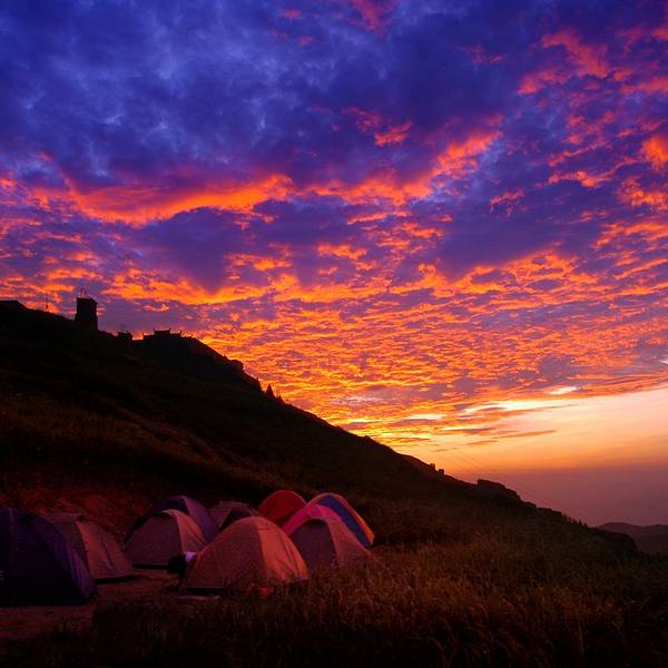 下午2点开车到山顶一个中转站的地方 路边都是租帐篷和卖小吃的 看到风车好激动~ 温度不高但这个季节还太阳还是比较晒的。要去露营地,还有有一段山路要爬。露营地分为天池和仙姑殿 天池海拔较低,他们有专车来免费帮忙拉行李 仙姑殿那里海拔高 最佳观日出地,但是要自己带着行李往上爬,阶梯很陡,我跟老公两人背着行李爬爬歇歇接近1个小时才上去,回来两天腿都是酸的。我们到露营地差不多下午4点 好位置已经没有了 只有厕所周边还有位置,有点味儿~有些人来的晚 车都要停在半山腰老远的地方 因为前面都停满了,上来也没有啥位置了,有些人甚至在石头突出的斜坡上搭帐篷 好辛酸啊!没办法 这个季节人就是多 又是周末。不过第二天下山途中发现有些人在其他地方搭帐篷 也很不错~只不过我们这些外地人不知道那些好地方罢了。 晚上山顶很热闹 就像夜市 大家吃东西 打牌 聊天 暂时告别都市的烦恼。对了 露营地有小卖店,老板人很和善,有免费热水可以泡面,还有烧烤架出租。自带帐篷需要交10块场地卫生费哦~ 半夜温度有点低 还好我们带了空调被 毛毯,透过帐篷的天窗,看到外面风车呜呜的转动 月亮很圆很亮,继续沉沉睡去。 早上4点多就有人陆续起来准备看日出,有的人裹着毛毯,有的人穿着棉袄,温度倒也没有那么低。天边慢慢浸出一缕红晕,天光也越来越亮,5:30左右太阳像鸡蛋黄一样突然跳了出来,若是昨天大雨 那么今早就有壮阔的云海了,最近都是大晴天,日出也就一般般了。 看完日出,收拾行李,大约6:30开始下山,结束想念已久的露营之旅~