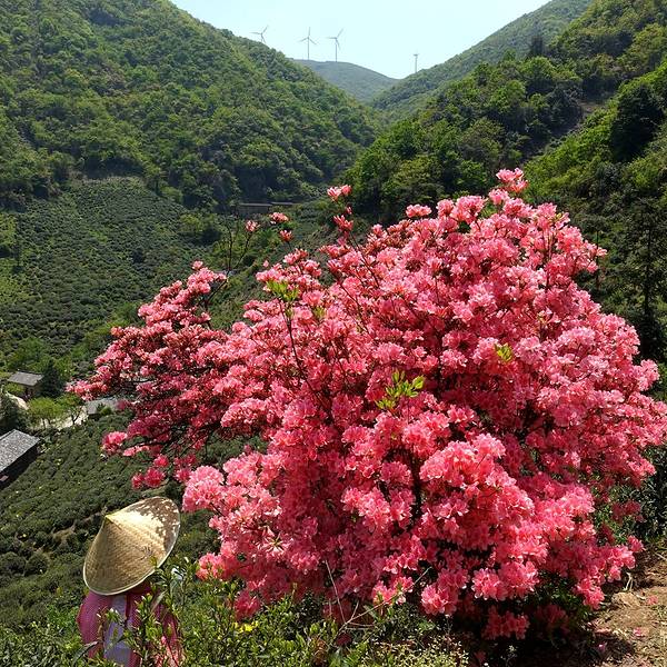 后来我们还是去了东白山,竹林,山路,茶园,并无特色,也许是因为我们没有登顶的缘故吧。我们只爬到半山的茶园龙门顶,这里有两棵美爆了的杜鹃。从这里也能看到山顶的风力发电机,大风车缓缓转动。