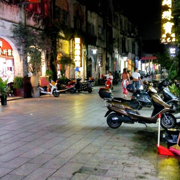 在民宿房间里放好行李我们休息了一下,等到太阳不再刺眼,我们决定去老街转转,于是我们在民宿租了2台小电摩,骑车出发gogogo!我爸搭着我妈,而我只能搭着我的相机包骑了半小时到了北海的老城区,去的时候刚好太阳接近落山,此时天边已经泛黄。懒得取包拿相机,随手用手机拍的 在海边晃悠了一下,我们就骑车到了北海老街附近。我们把小电摩停在街口路边的停车区,步行进入老街里。北海老街是一条有近二百年历史的老街,沿街全是中西合璧骑楼式建筑的商业老街临街两边墙面的窗顶多为卷拱结构,既可遮风挡雨又可躲避烈日。在老街晃悠一定记得尝一尝糖水和虾饼。炎热的夏天吃着刚炸出来的虾饼喝着沁凉的糖水,用 长沙 话说就是 好韵味