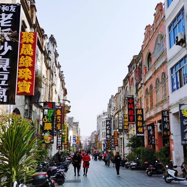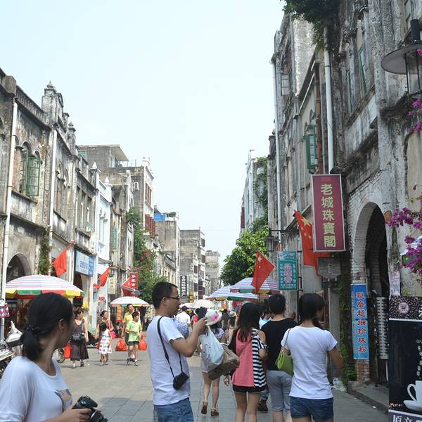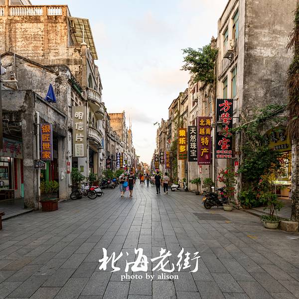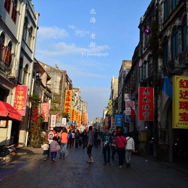 北海老街位于珠海路及中山路区域,是一条始建于1821年的街道,这条1.44公里长的老街两旁,分布着英法德等国领事馆旧址、德国森宝洋行旧址和天主教堂女修院旧址等许多中西合璧的骑楼式建筑。 如今的北海老街已被开发成一条特色的商业街,出售各种商品,你也可以在这里吃到比如香辣花螺、虾饼、猪脚粉等各种当地美食。漫步在北海老街,你还可感受不一样的市井风情:躺椅上摇着蒲扇哼着曲儿的老人、聚在一起吃饭、聊天、打牌的居民等,这些都可以成为摄影爱好者镜头中的主题。 北海老街的入口处竖有一门楼式牌坊,门额上镶嵌着一块石匾,上面写着“升平街”三个楷书大字。北海老街上的建筑大多为二至三层,墙壁基本都由灰、黄、黑三种色调构成。每一栋楼的正中,都刻有自家的印记,如“陈荣和”、“潘德祥”之类;街上亦有天主教堂、药堂、酒肆、茶坊等。你可以从一个个斑驳残缺的招牌或刻印于骑楼之上那逐渐褪色的字迹中,寻找北海老街昔日辉煌的痕迹。也可以从沿街的商铺、咖啡厅、小吃店中感受这里如今的热闹。