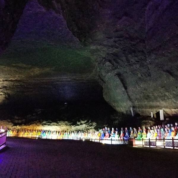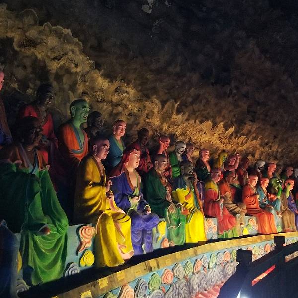 进入西坡景区选择乘坐景区观光巴士直达索道站。北坡山势奇秀险峻,乘坐索道上山后,还可以走走山上残存的古栈道“永灵古道”。北坡的山上分布着很多天然溶洞,以古佛洞最为著名,洞中有一个巨大的洞厅,四壁的佛像在光影中显得很是神秘。洞厅一侧有500罗汉阵,沿着罗汉阵前行就走到出口。洞口三面悬崖,背靠高山,天气晴朗的时候,这里是观赏金佛山云海的绝佳位置。