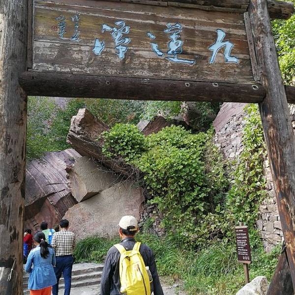 九莲山景区大门靠近八里沟景区大门,我们买的联票,两天有效,一天玩了两个景点,很匆忙,没有尽兴,对于我们来说八里沟玩一天,九莲山玩一天比较好,建议大家九莲山玩一天。我们进入景区乘车去九莲梯停车场,游...
