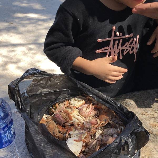 飞蟹:7只卖200元,没考虑它加工好后我们四个人坐在路边一通吃,边吃阿姨边说这个比咱们在家吃的鲜很多。小心心在睡觉