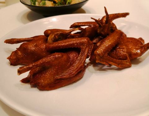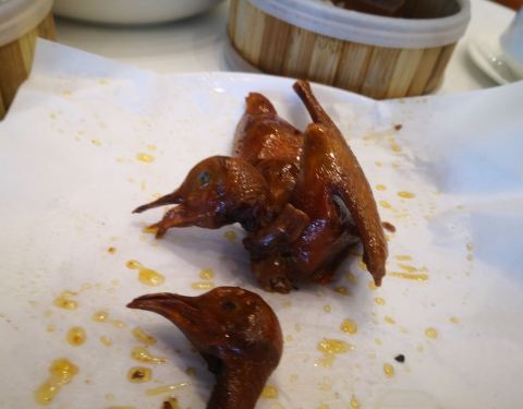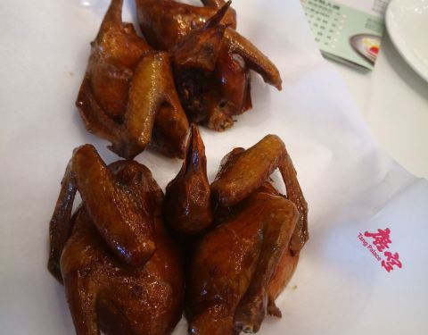 周末和朋友相约喝早茶,多少人因为爱他加的乳鸽,而喜欢唐宫。但他家的乳鸽真的是很棒呀,外脆,内嫩多汁,套上手套,吃起来特别过瘾。 虾饺内两个虾仁外加笋的颗粒,也是很鲜,但没配醋是忘记了?还是他家就这样? 醉鸡记忆深刻,不是那种酒味很厉害很冲的,我就喜欢这种略带甜的。 流沙包,蒸排骨,黑松露粉丝煲也都很好吃。