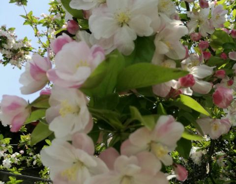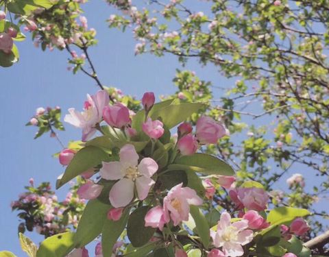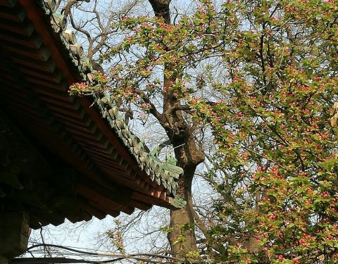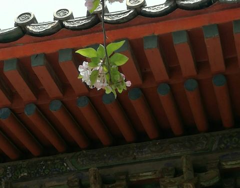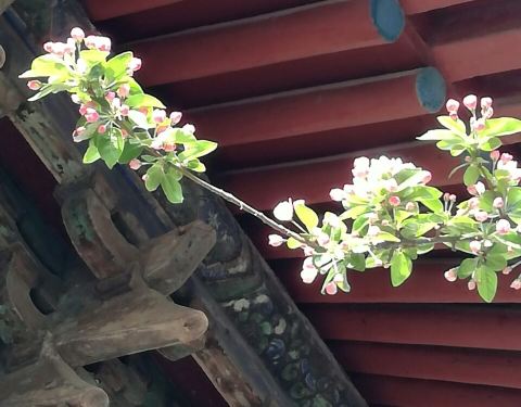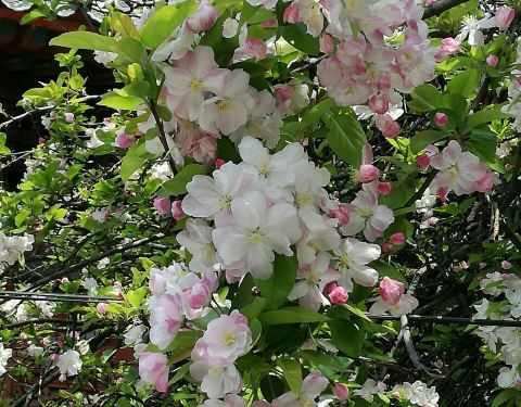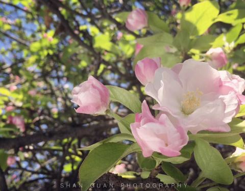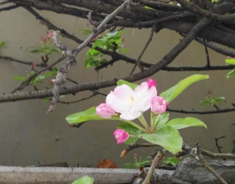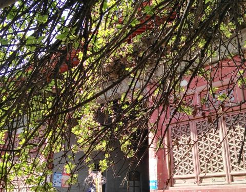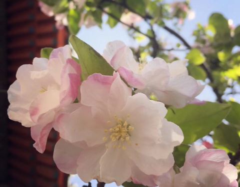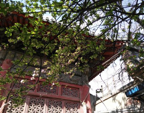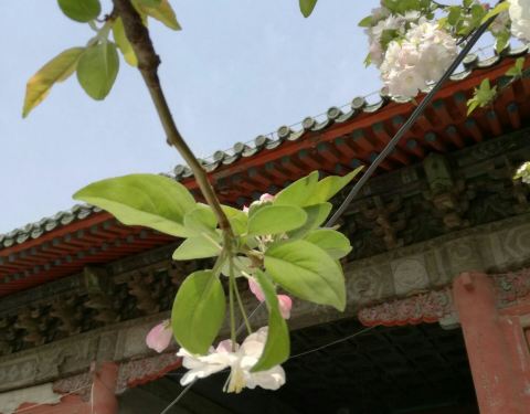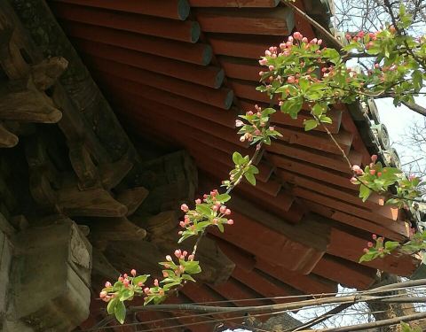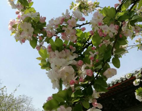 原先,孚王府的大杂院里有一家餐馆,深受附近居民的青睐,初逢西府海棠那回全因为我偷了个懒,从餐馆的后门溜出来抄近路去公交站。可巧,就看到大杂院中两棵如覆绛雪的西府海棠在雾霾之中开得正盛。还好那时候不时兴戴防霾口罩,一阵雾霾风过,我闻到了淡淡的香气。我满院子找了一遍,分辨出整个大杂院能发出香气的必属那两棵开满了不知名花朵的老树,于是凑上前去。那树上的花,粉红似施淡粉,柔弱似稍有扶病,瞬间,我被那花的风度给迷住了。再仔细看看,这府邸前的两棵西府海棠已称得上是蹉跎老树,这样品级的树木没有被保护起来,反而是被搭建在树下的临时民房挤得歪七扭八,显得凄惨不已。 但是偌大的树冠无怨无悔,努力长得更高,不仅为石狮子遮荫纳凉,也大大超过了侵占自己生长之地的民房,以德报怨,将其庇护与树冠之下,即使连日阴雨,站在树下必然丝雨不必沾身。 那是两棵虽然能开出娇弱花朵、却足以抵挡风雨的树。