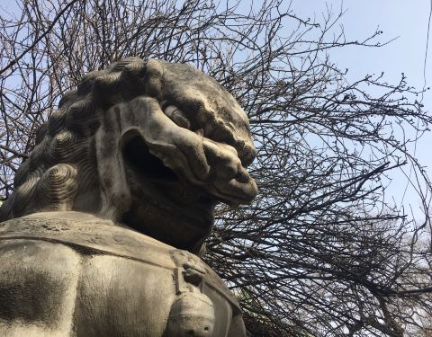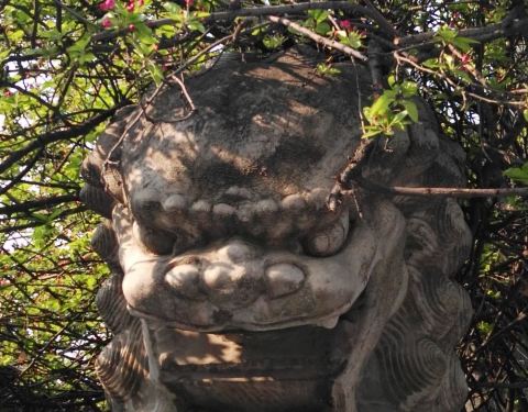 那还是几年前的故事,在民方饭店吃过饭从后门出来,忽然闻到一股淡淡的清香。走进一看,是两棵大大的海棠树,还有两尊狮子石雕,这就是孚王府。