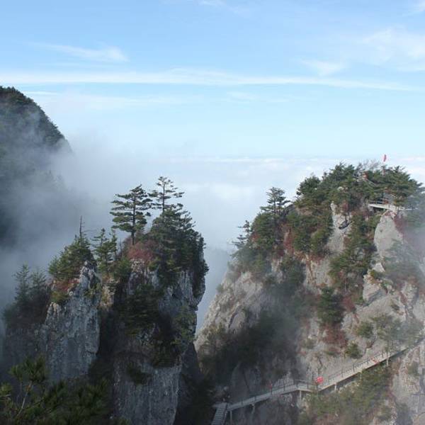 天竺山最险峻的地方要数刀背梁了。刀背梁,顾名思义,可以想象梁顶部的宽窄和坡度大小都十分惊险。据当地人介绍,过去刀背梁栈道未修时,只有少数几个胆大的探险者才能来到这里,绝对是如履薄冰,小心翼翼。