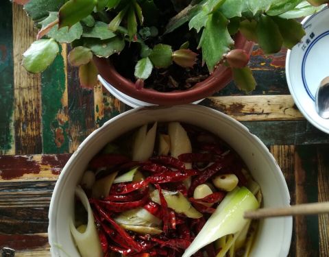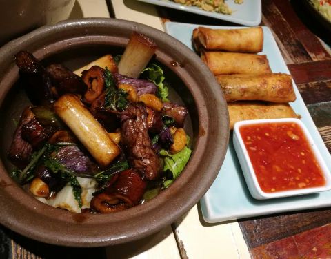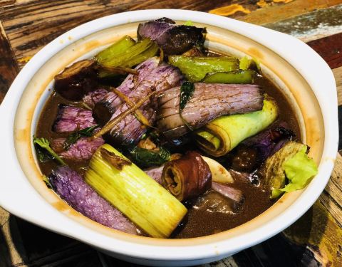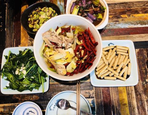- 茄子大肠煲重口味,桂花糖年糕弹牙甜,孜然菠菜吃出羊肉味,椒麻鸡一整只,必点