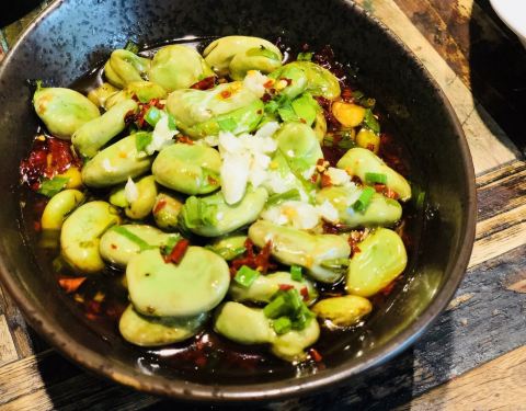 第一顿,油淋蚕豆,火辣辣!茄子大肠煲重口味,桂花糖年糕弹牙甜,孜然菠菜吃出羊肉味,椒麻鸡一整只,必点!