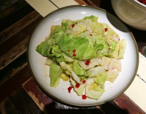 最早的那家店,是开在灵隐景区的吧?分店开到良渚来,旁的不说,那种傲人的气场也是没谁了。事先服务员已经告知了上菜速度回比较慢,已经做好了心理准备,但是,最后还是等到快潸然泪下,整整90分钟,菜才上齐。。。 应该是最近遇到过的最没服务存在的店,还没来得及吐槽,门口的那块牌子早已标明了一切,黑板白字写的清清楚楚,不外乎“我们上菜很慢”、“我们不会来换盘子”、“我们的菜你不一定吃得惯”这三点,so,不管什么吐槽,都得乖乖憋回去。 再来说说菜品吧,冰淇淋草色拉,冰草本身不新鲜,吃起来软趴趴的,至于淋上去的汁,酸的可以,怎么感觉像是纯醋似的。 至于豆腐干蒸腊肠,豆腐干本身还可以,不是老豆腐干,吃着略嫩,可惜分量偏少;腊肠不是切片,而是切段,里面的填馅是混合肉糜,鲜味儿不是很明显,最后,汁水太多了。 芥末花蛤是最坑爹的一道菜,芥末味儿非常淡,花蛤不仅很瘦没什么肉,而且吐沙不干净,吃完一个就是满嘴沙。 孜然菠菜相对而言味道还不错,有种烤蔬菜的感觉,上面撒上了孜然粉,咸淡也正好,稍稍偏生的口感吃起来反而多汁,挺好的。 酸辣包心菜就比较low了,无非就是泡菜热做,作为特色菜之一感觉并不够格,况且,泡菜本身腌的就不算好哎~ 98一份的椒麻鸡,总算对得起推荐菜的头名,花椒那麻嗖嗖的感觉确实深入到鸡肉内部,不像之前吃的大多数椒麻鸡仅仅是闻起来有点椒香味,麻味凸显的很明显,辣味作为辅味,没有过辣而掩盖了麻味。当然,鸡肉本身也还可以,作为辅菜的大段京葱,也很合适~