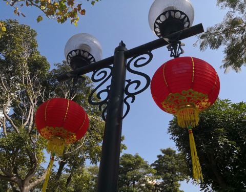 大年初四,春日融融。公园里人不多,安静而美好。打牌的闲客,锻炼身体的老者,让节日里的公园添了更多的闲情,外面车来人往,公园里却静谧详和,沿着小路挂着的一排红灯笼,告诉我们,这是新年!