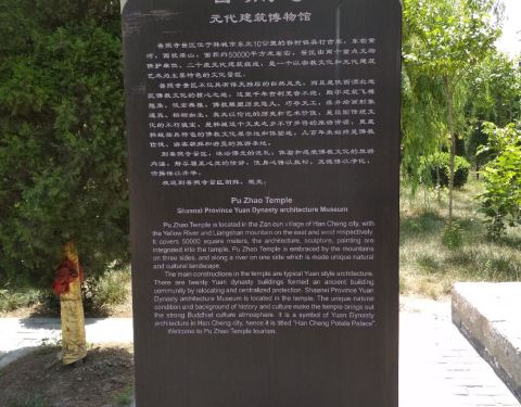 從韩城市区搭到大桥的公車至昝村鎮下车,走500米即到,我是先去龙门再往回返程車至此。镇中心是市场,路兩边全是賣菜及雜貨的,庙门口到还算清净些。庙内有高神殿,紫云覌二座從市区搬遷过來的庙宇,仍处整修中,及一個標示简短说明一下,对庙的始建年代,及历代重修未见介紹。普照寺本殿也未見任何解说只註明元代建筑,韩城坐擁如此珍貴的历史资源,却没用心照顾,令人遗憾。庙本身位於一高地上,登階而上,遠眺四週,心旷神怡,很好的地方,可惜。