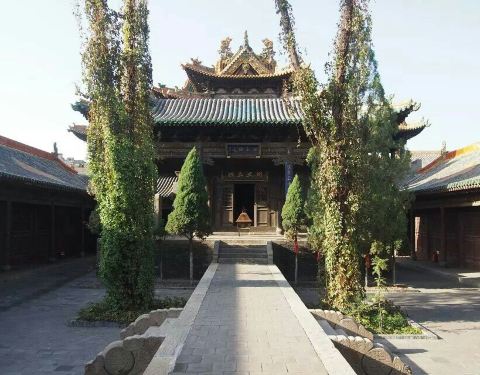 介休后土庙,位于介休市老城西北角,为全国重点文物保护单位之一。后土庙古建筑群有两条中轴线,东部为一条南北中轴线,后土庙影壁、山门过殿、子孙娘娘殿,以东横向依次为吕祖阁、关帝庙、土地祠、三连戏台。