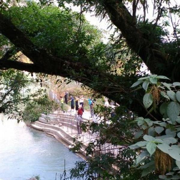 百魔洞又名百魔天坑,距离巴马长寿村约十分钟的车程。这是一处雄伟壮观的天然溶洞景观。钟乳石、石笋造型千奇百怪,气势恢宏的穿岩、神秘的天坑和缓缓流淌的盘阳河水又为其增添了一丝清秀的气息。 步入百魔洞便能感受到这里空气与众不同的清新,据说是负氧离子含量更高所致。穿行在百魔洞中,孔雀迎宾、良田万顷、金山猴王、杜甫吟诗等精巧的钟乳石造型都让人叫绝,而且洞内有洞,洞洞相连,十分奇特。