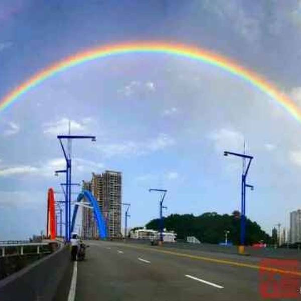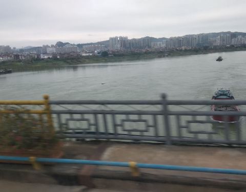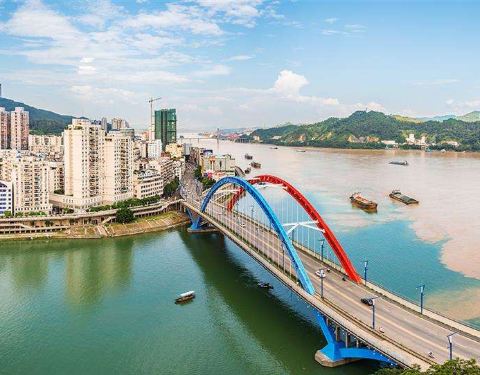号称“鸳鸯”的不仅有江水的颜色,还有江上大桥一红一蓝两条卧波