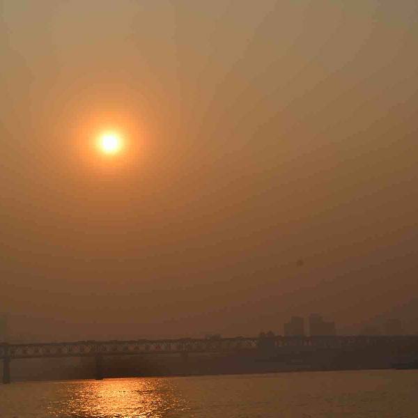 日落时分汉阳门码头拍橘色晚霞与桥体同框。