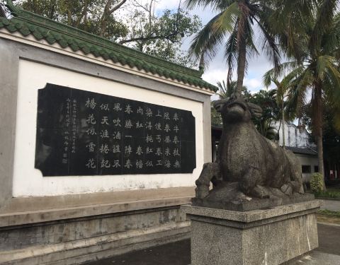 中和古镇是北宋大文学家苏东坡贬谪海南时居住和讲学的地方。苏东坡在1097年从广东惠州任所贬到海南岛,先是居住在昌化军使安排的官屋,后来湖南提举董必察访广西时,把苏东坡从官舍中驱逐出去,使他不得不“偃息于桄榔林中”,昌化军使张中、仰慕者黎子云等共同帮助苏东坡在中和镇城南的桄榔林建房,在众乡亲的帮助下建起了三间茅屋。虽然周围虫蚁滋生,但茅屋处在“竹身青叶海棠枝”的桄榔林中,东坡宽慰之余便将茅屋命名为“桄榔庵”。后来苏东坡引用《汉书•杨雄传》中“载酒问字”的典故,欣然命名其屋为“载酒堂”。