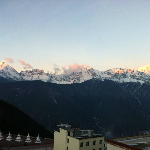 飞来寺附近住宿条件非常好,大家不用担心。如果想非常完美的拍摄日照金山那必须买门票进入飞来寺,如果不买住在附近也可以。日照金山的景色是一样美丽的,但是拍起来很容易把屋顶和电线杆子拍进入画面,看个人需求了。