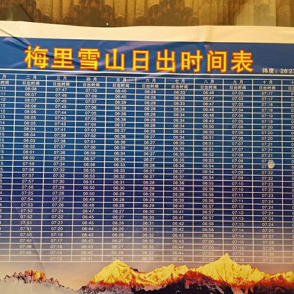 梅里的日照金山是在早上,随季节变化时间也不一样,飞来寺所有的酒店都有全年日照金山时间表(见图3)。