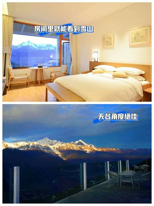 1⃣️德钦腾悦·梅里雪山度假酒店,几乎位于小镇最高处,屋顶视线极好,是看日照金山最佳角度之一。不过国庆期间这里房价飞涨,好一点的都要1000+,且一房难求。