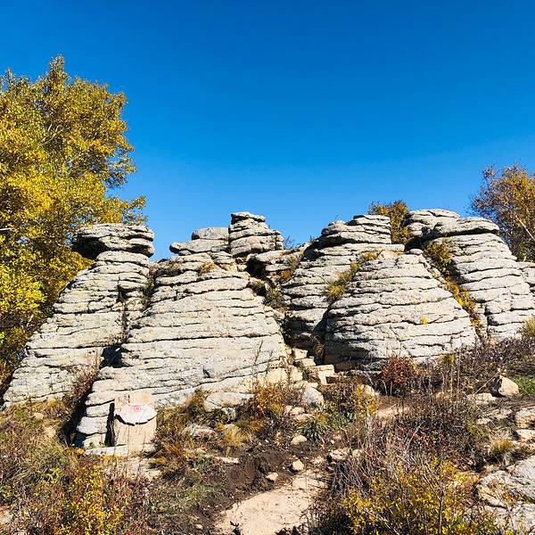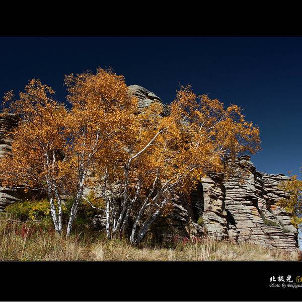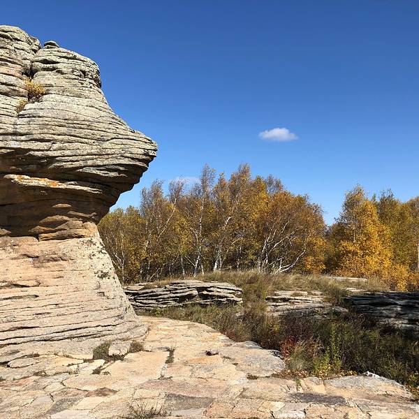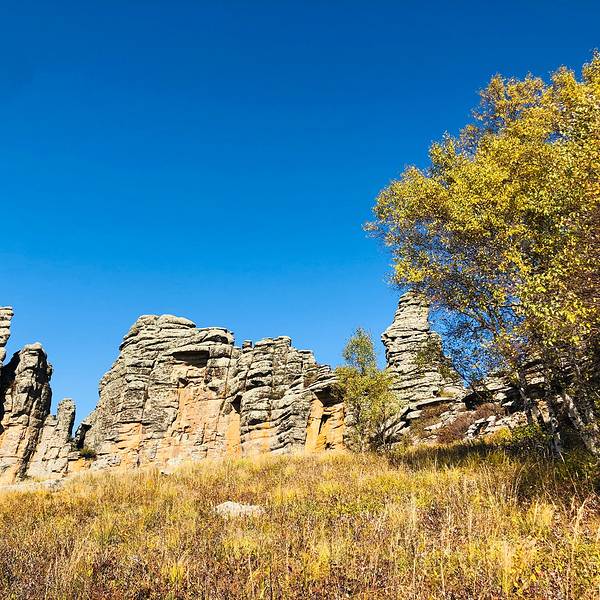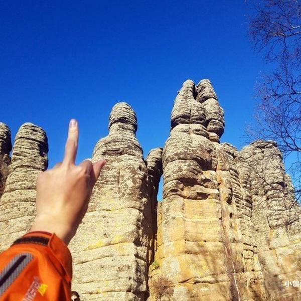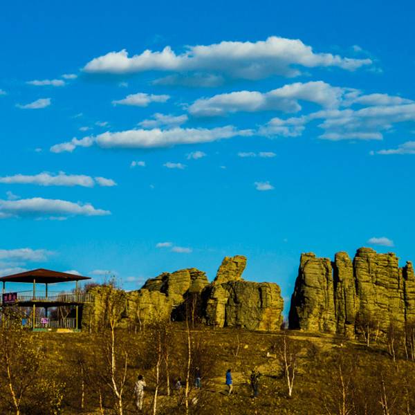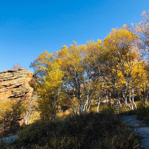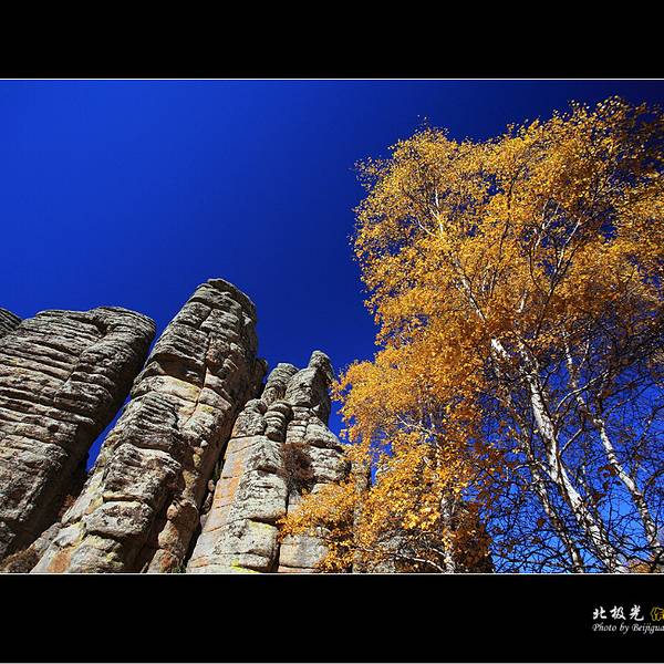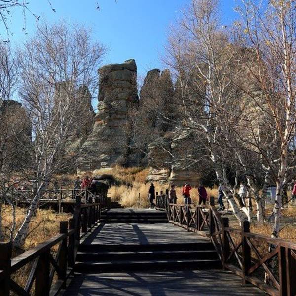 第一景区有很多好玩的去处,刚进来的时候可以看到一块大的如同屏风一般的石头,正面看有点像帆船,往里面走,还有一片大的石林,有叫将军床的,有叫七仙女的,不过我还是觉得在山崖边上的有点像城堡一般的石头更漂亮一些。山顶上除了石林,还有一片白桦林。秋天的白桦林是不可多得的美景,色彩亮丽,但是一定要在秋风扫落叶之前来,不然的话叶子都落了就没那么好看了。