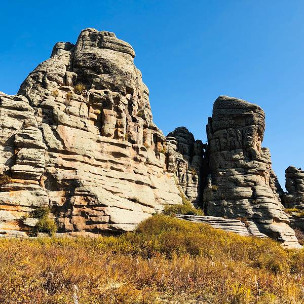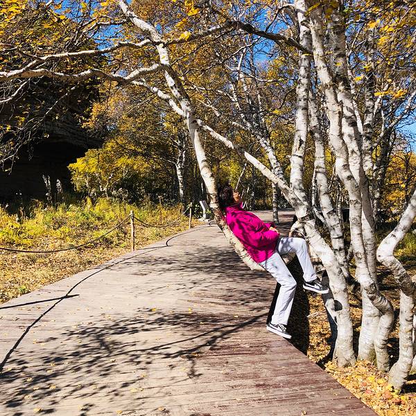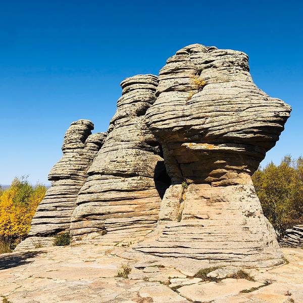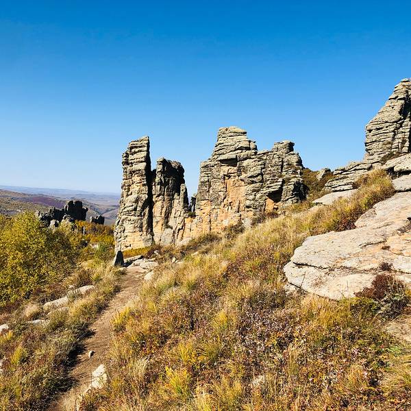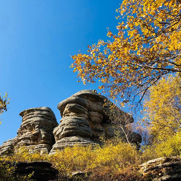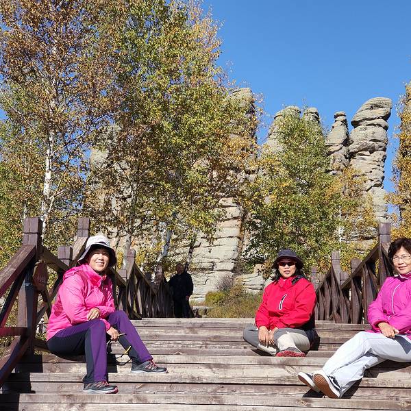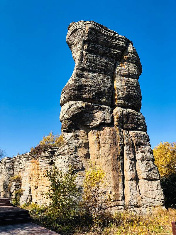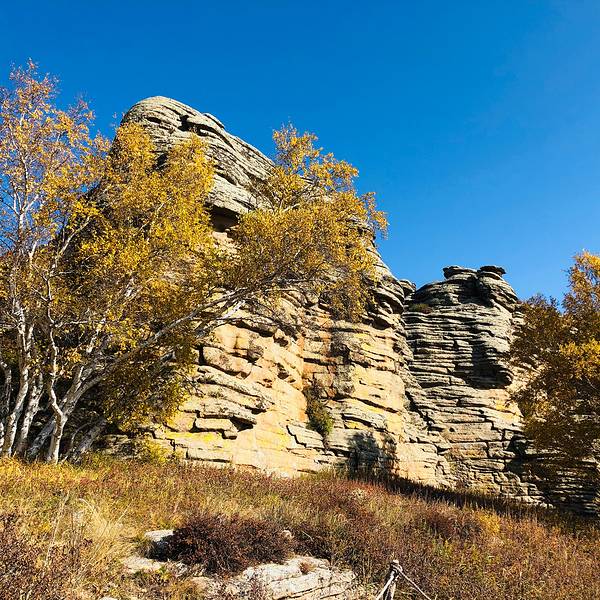 第一景区有很多好玩的去处,刚进来的时候可以看到一块大的如同屏风一般的石头,正面看有点像帆船,往里面走,还有一片大的石林,有叫将军床的,有叫七仙女的,不过我还是觉得在山崖边上的有点像城堡一般的石头更漂亮一些。山顶上除了石林,还有一片白桦林。秋天的白桦林是不可多得的美景,色彩亮丽,但是一定要在秋风扫落叶之前来,不然的话叶子都落了就没那么好看了。