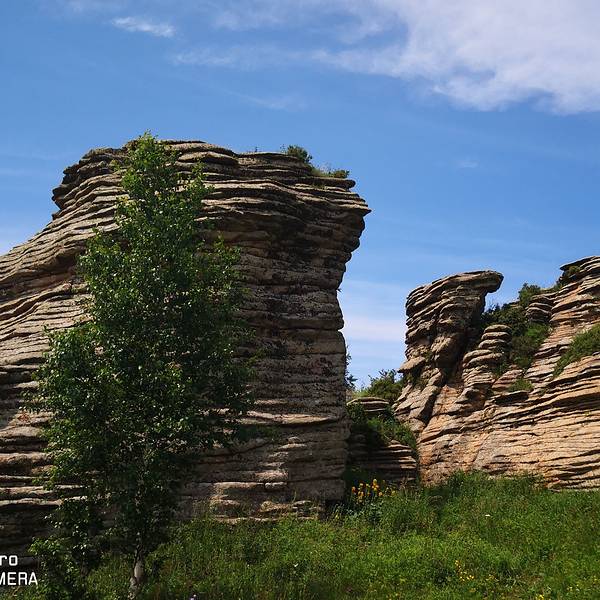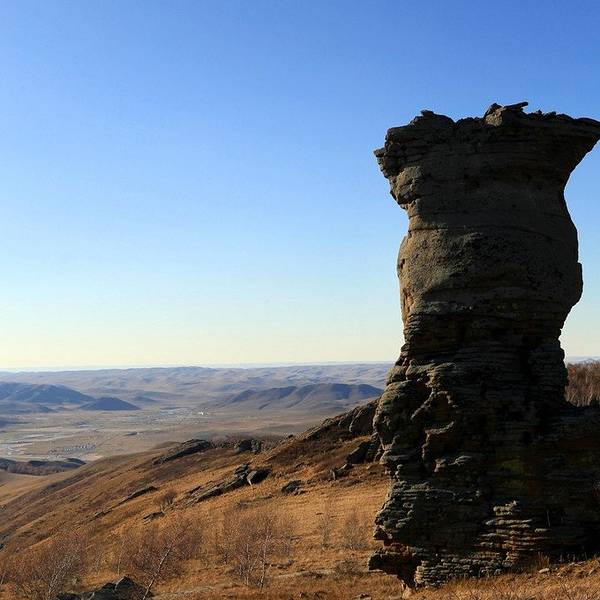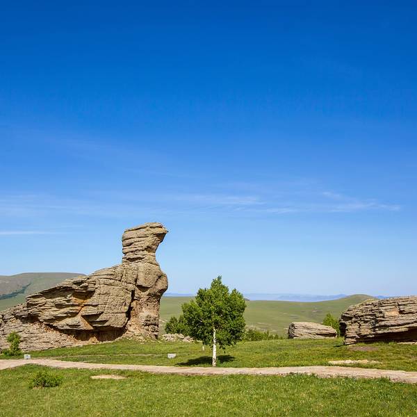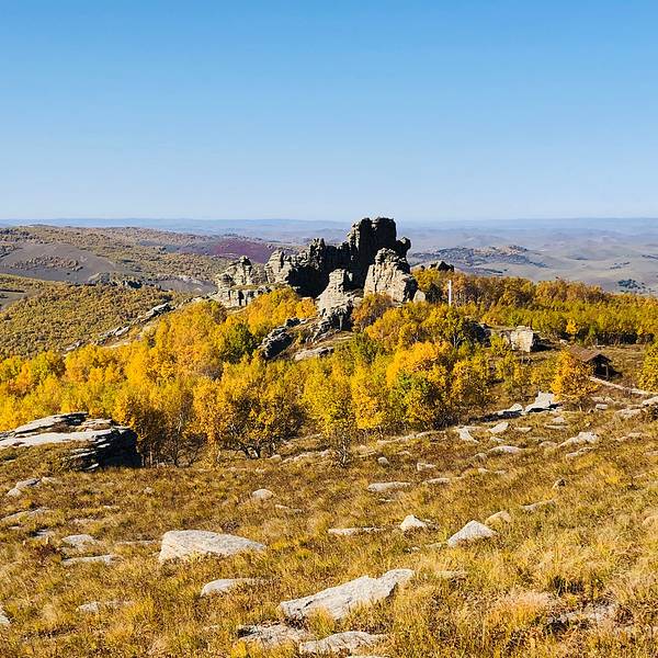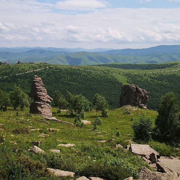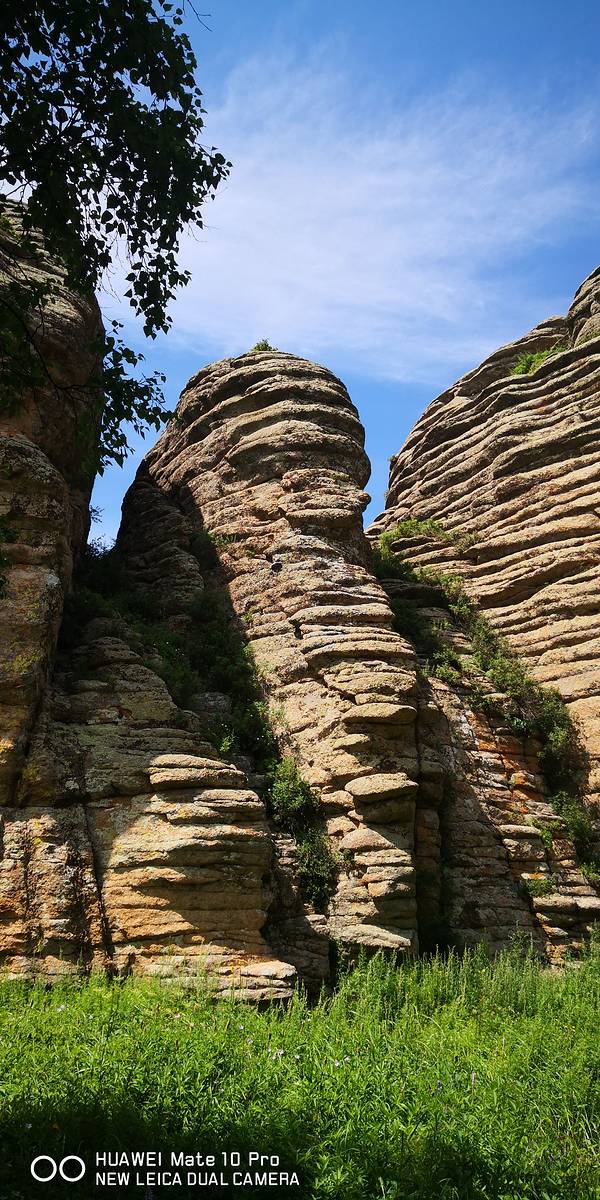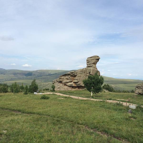 阿斯哈图石林景区门票120元/人(内含20元景区内观光车)。阿斯哈图石林景区既然叫石林,顾名思义就是里面怪石嶙峋基本都是一些被风化了的巨石。里面分为四个景区,景区很大但基本不用怎么走路。进入景区以后门口的位置就有景区的大轿子一路盘山将游客送入景区核心位置。景区核心位置分别有通往四个景点的支线观光车,想要去那个景点坐那边的车就好,非常方便。我们按照观光顺序,选择了一景区。一景区应该算是这里面比较核心的景区之一了,下了观光车需要步行大约500公里。一路上没遮没挡的一定要注意防晒。里面大都是一些象形石,石头下面都有景区立的牌子作为讲解,所以即便没有导游也能明白。这个大石头叫做拴马桩,除此之外二景区里面还有个三结义,原谅爱拉真心没看出来,所以就没拍。三景区的这个鲲鹏鸟爱拉确实看出来了像鸽子。离开三景区时被告知四景区正在维修,好了正好也感觉饿了。所以不遗憾,出去吃饭此刻是头等大事。景区门口的小餐馆有牛肉面或是盖饭啥的,我们选了半天决定杀回刚刚路上经过的巴亚查干苏木吃午餐。那里毕竟是个当地人生活的小镇,随便找个参观应该也比景区门口吃的会好一些的。在镇上一家小店随便点了两个菜,囫囵的就吞下了,感觉味道还不错,也许是真饿了。吃饱饭以后,离开巴彦查干苏木。开车上热阿线,往热水镇方向出发。下面的图片是爱拉9月份走热阿线的的图片。上面的阿斯哈图石林景区是6月份去的,所以两边的风光不大一样。热阿线爱拉以为是秋天的较美,达达线这边则是6-7月最美。